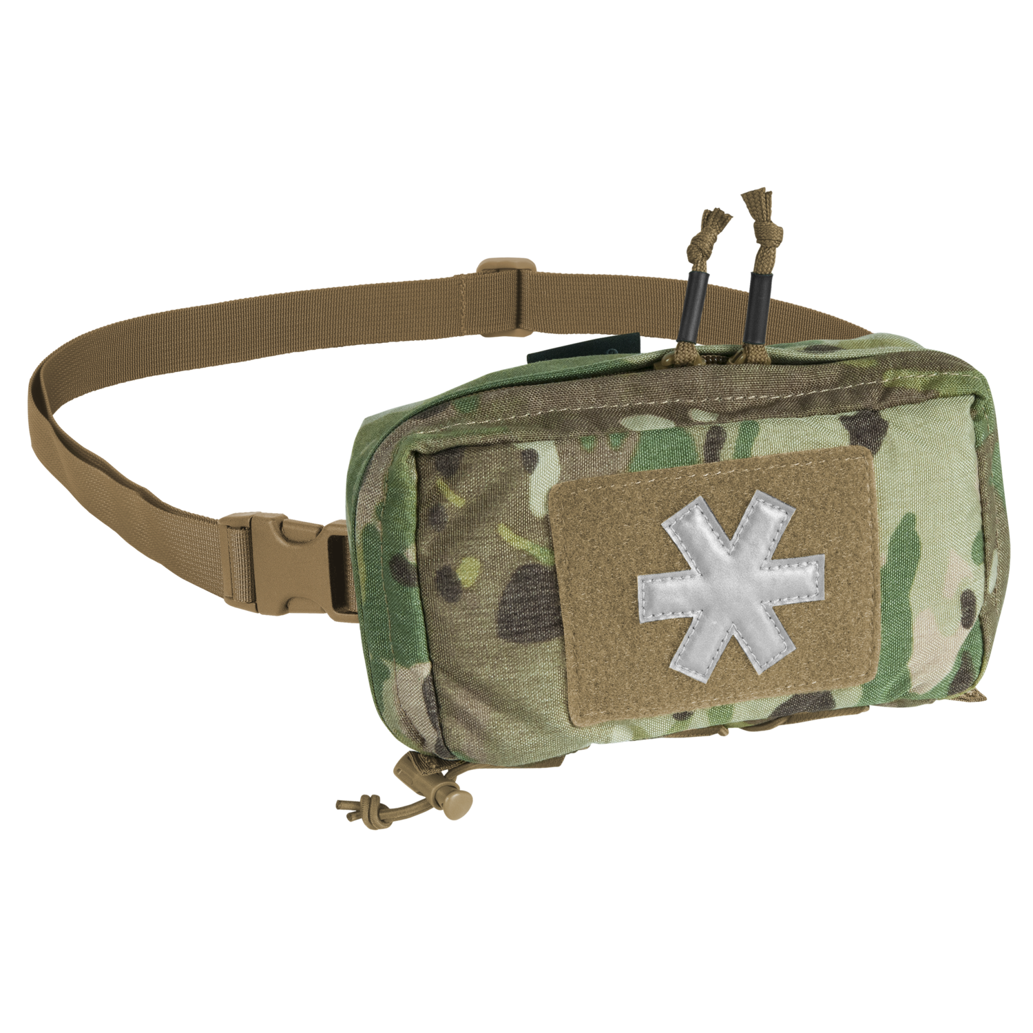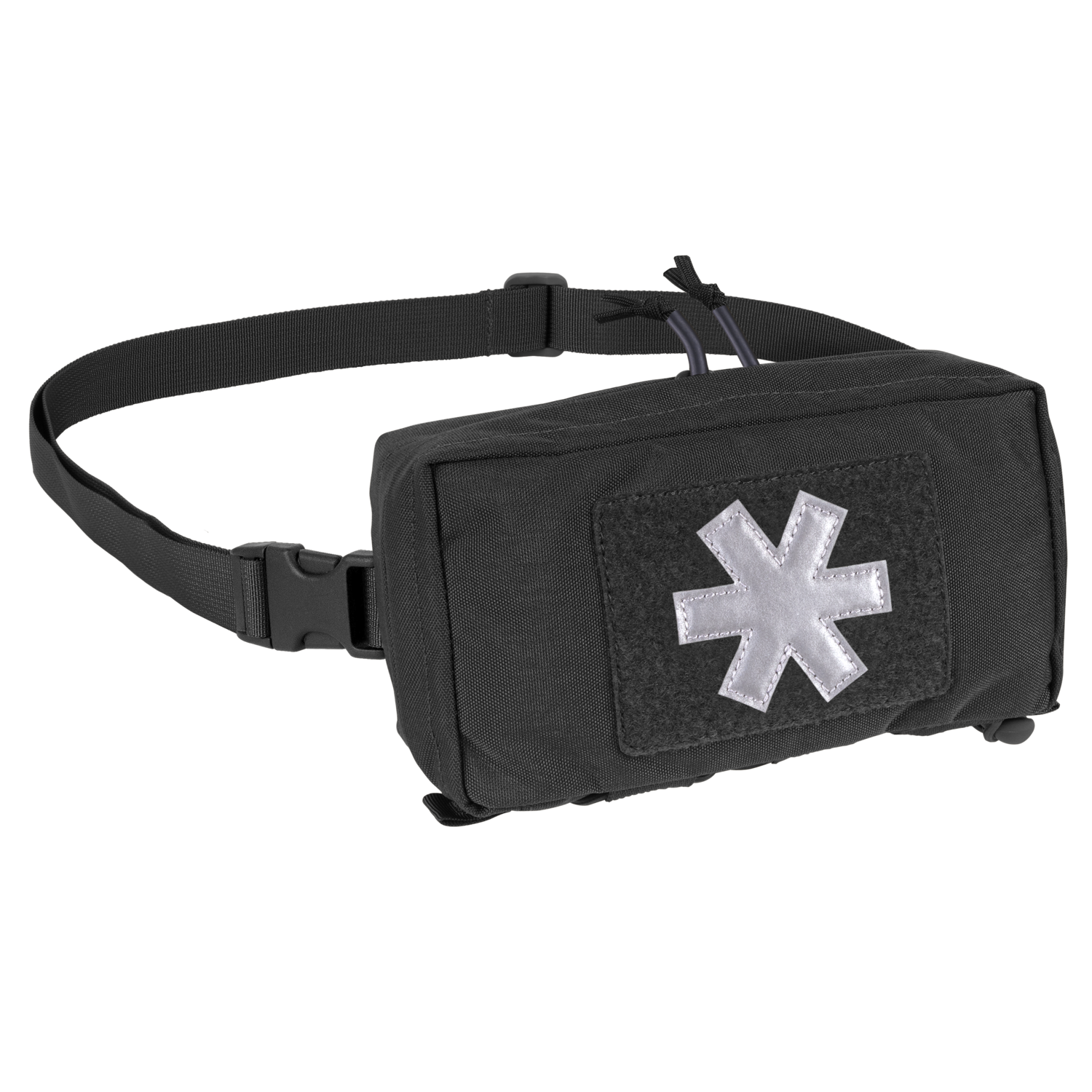 The pouch is accessed via two-way zipper. Inside there is velcro panel for mounting the Med Insert, two elastic ribbon loops, two Paracord loops and a mesh pocket with elastic drawstring. The pouch is available in several colors, has a velcro panel with a reflective paramedic cross embroidered, detachable hip belt, and in the bottom part, three ribbons and an elastic drawstring. It is MOLLE/PALS-compatible.