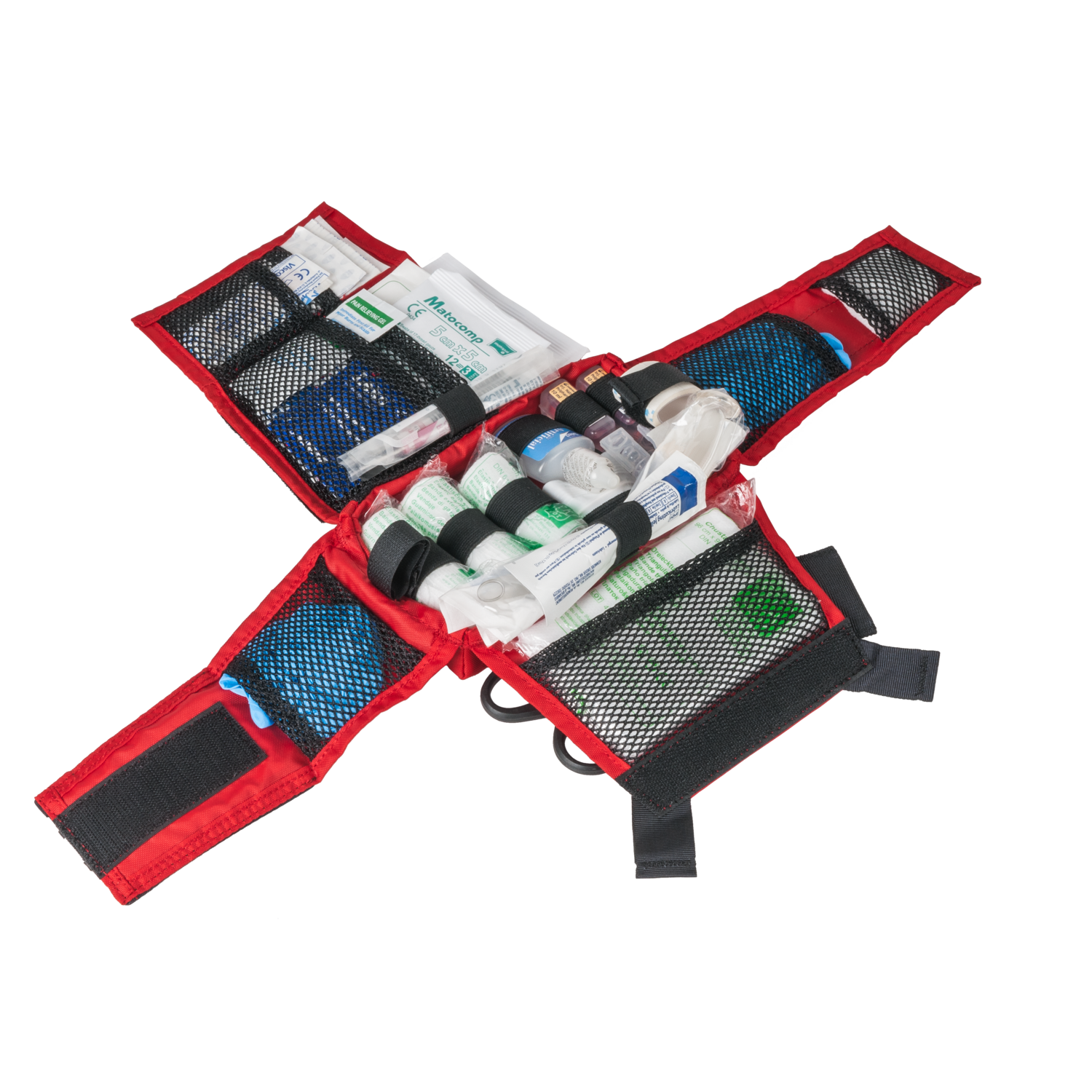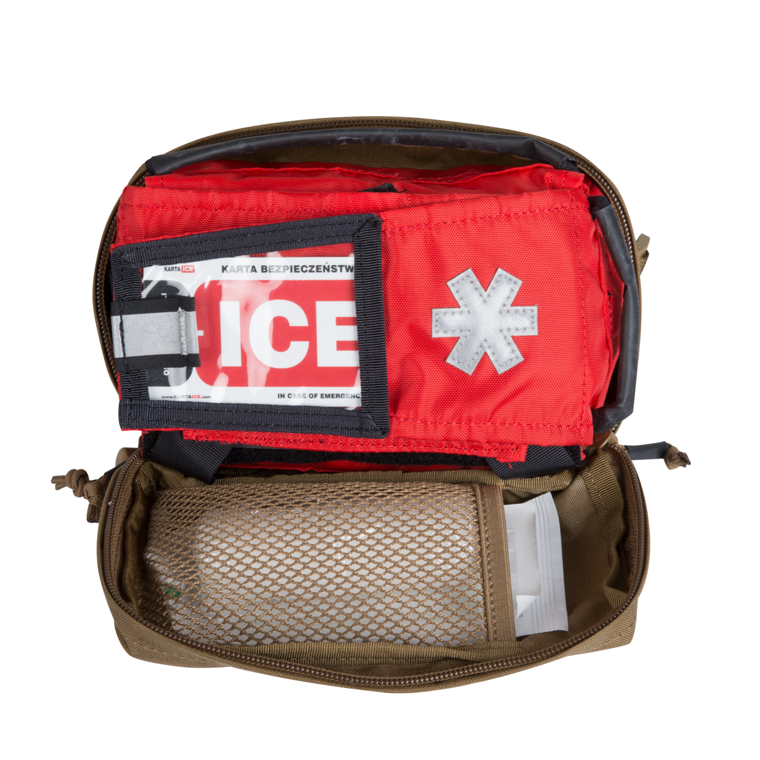 The Insert opens to the sides, providing instant access to the contents segregated at user’s discretion. Segments of the insert can be easily closed with velcro and open with deliberately placed opening loops. On opening the rescuer has access to whole of the med kit, without the necessity of additional opening or shifting the components. The Insert is red, which together with reflective elements (Paramedic cross and carry handle) on the flap aid in quick finding the Insert – vital at low light or turmoil, etc. of the rescue mission.