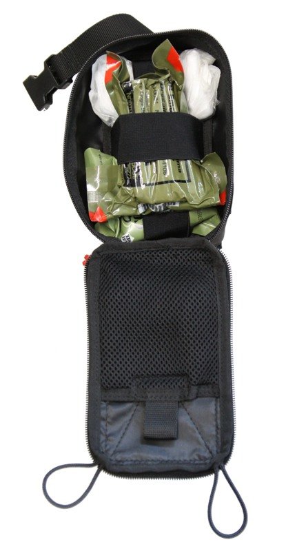 IFAK met 2 molle-straps waarmee de pouch bevestigd kan worden op een molle-vest of op een (standaard) riem.  De pouch kan gemakkelijk losgetrokken worden van de molle-straps door de velcro-bevestiging zodat deze in nood ter hand genomen kan worden of naar een persoon in nood kan geworpen worden.
