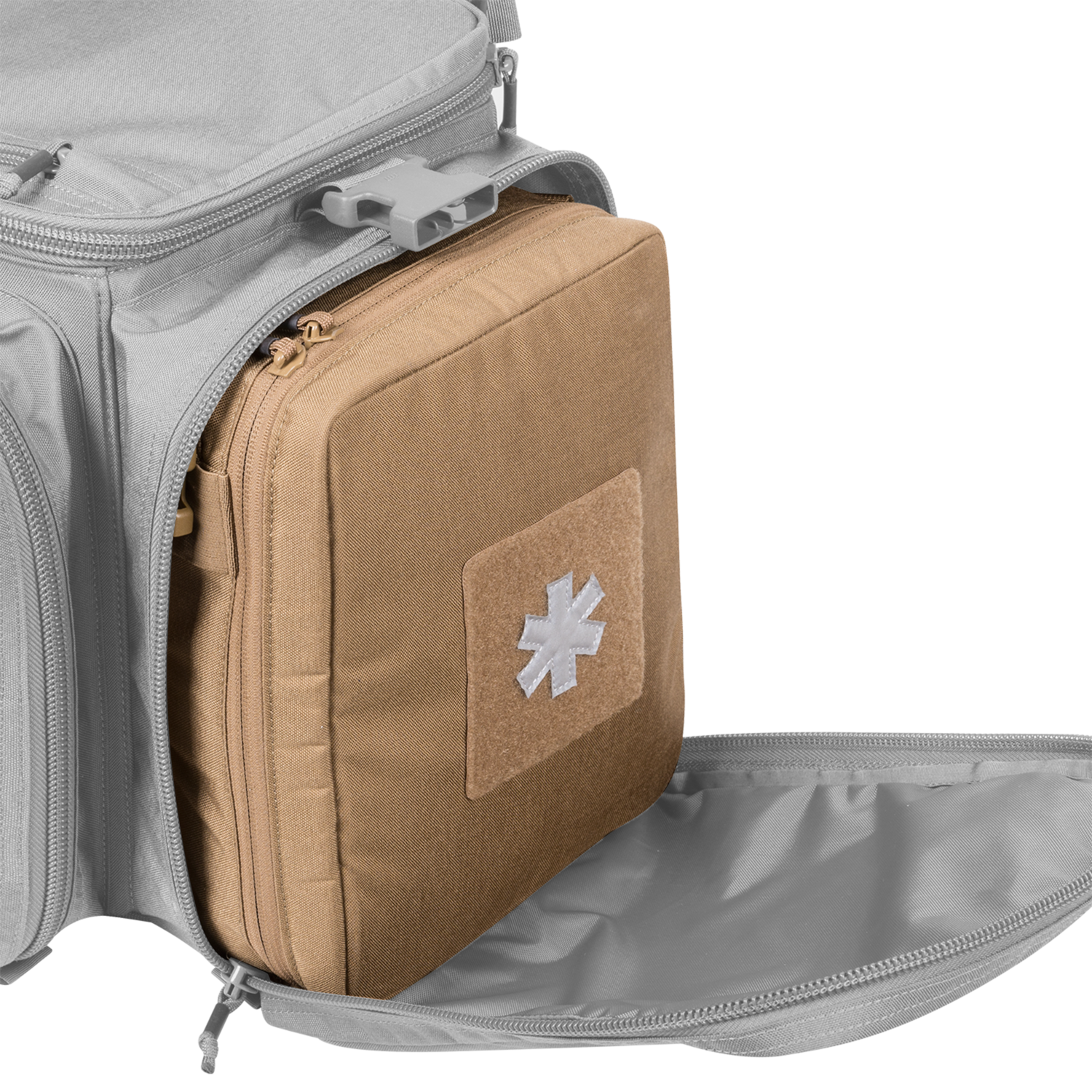 Hook&loop on the back of the med kit (with possibility of covering them) that allows attachement of the first aid kit to the upholstery in the trunk or loop panel (e.g. in Rangemaster Gear Bag®)
